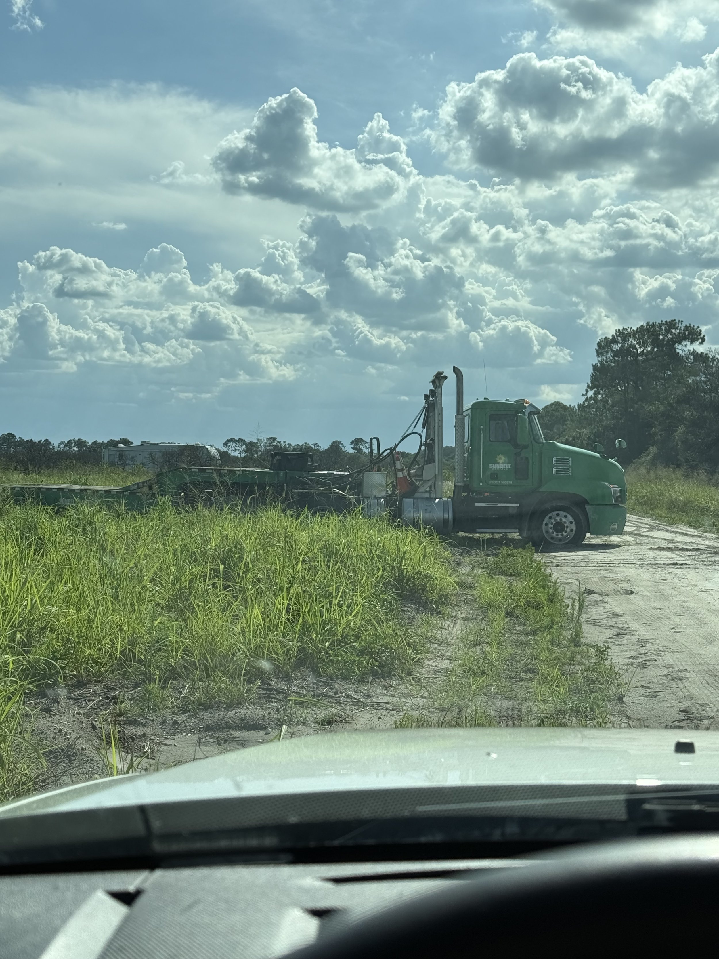 Unfortunately, that’s the extent of the good news. For reference, my farm is down a somewhat narrow dirt road, completely off the grid. When the Sunbelt Rentals guy dropped off the tractor, they sent him with a full-sized trailer, even though I had told them it was a narrow road. Instead of driving straight and making more turns to exit the area, he decided to back up onto the field, which is sugar sand, and then drive the way he came. Yeah, didn’t work. He got his semi stuck in my field, and I waited with him for 4 hours until a wrecker could come out and tow him free. But don’t worry, that’s not the only time I used tow services this trip.